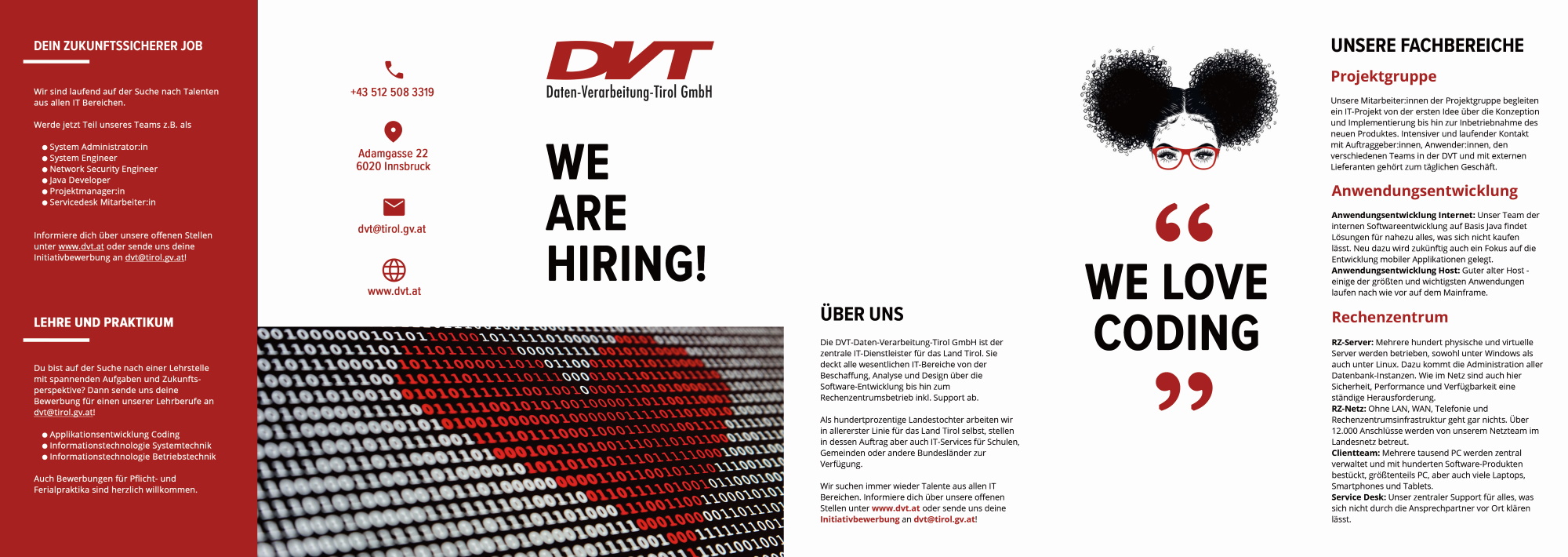 Wenn du Interesse hast, motiviert und teamfähig bist, dann zögere nicht! Sende deine aussagekräftige Bewerbung mit Lebenslauf und Foto entweder per E-Mail an dvt@tirol.gv.at oder an DVT-Daten-Verarbeitung-Tirol GmbH, Adamgasse 22, 6020 Innsbruck, oder verwende unser online Bewerbungsformular.